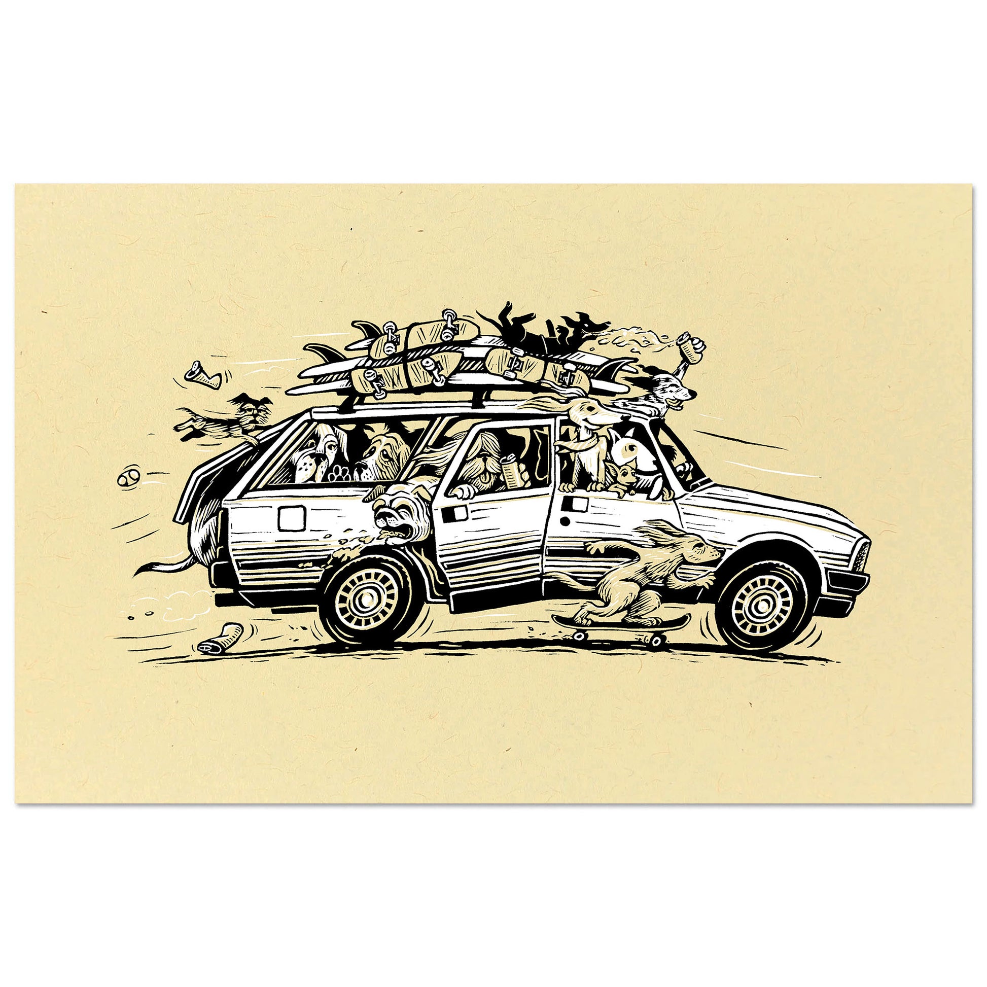 Beach Bound Hounds captures the fun of dogs piled into a Peugeot wagon, heading to the beach with skateboards and surfboards strapped to the roof. This is the 2nd edition of 100 from the 2023 pressing on manila yellow 100 lb kraft paper, differing from the first edition on kraft paper.