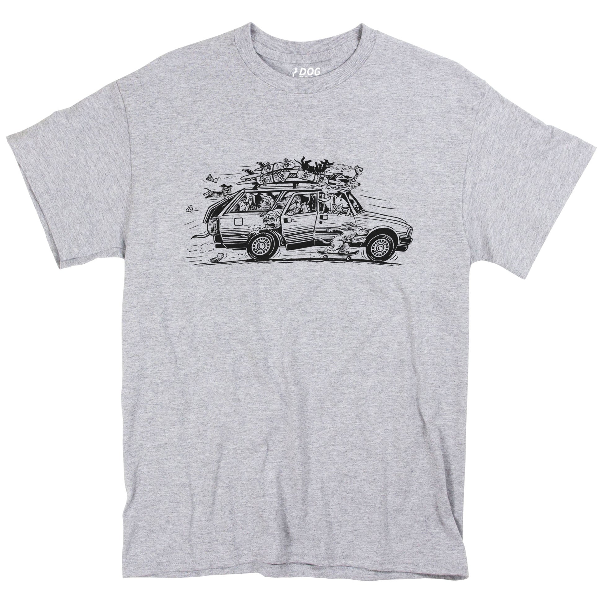 This Beach Bound Hounds shirt captures adventurous dogs piled into a Peugeot wagon, heading to the beach with skateboards and surfboards strapped to the roof. A perfect addition to any surfer, skateboarder, or dog owner's everyday wear!