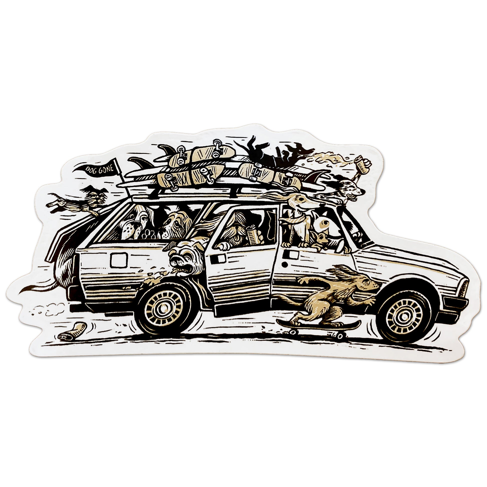 This Beach Bound Hounds vinyl sticker captures the fun of dogs piled into a Peugeot wagon, heading to the beach with skateboards and surfboards strapped to the roof.