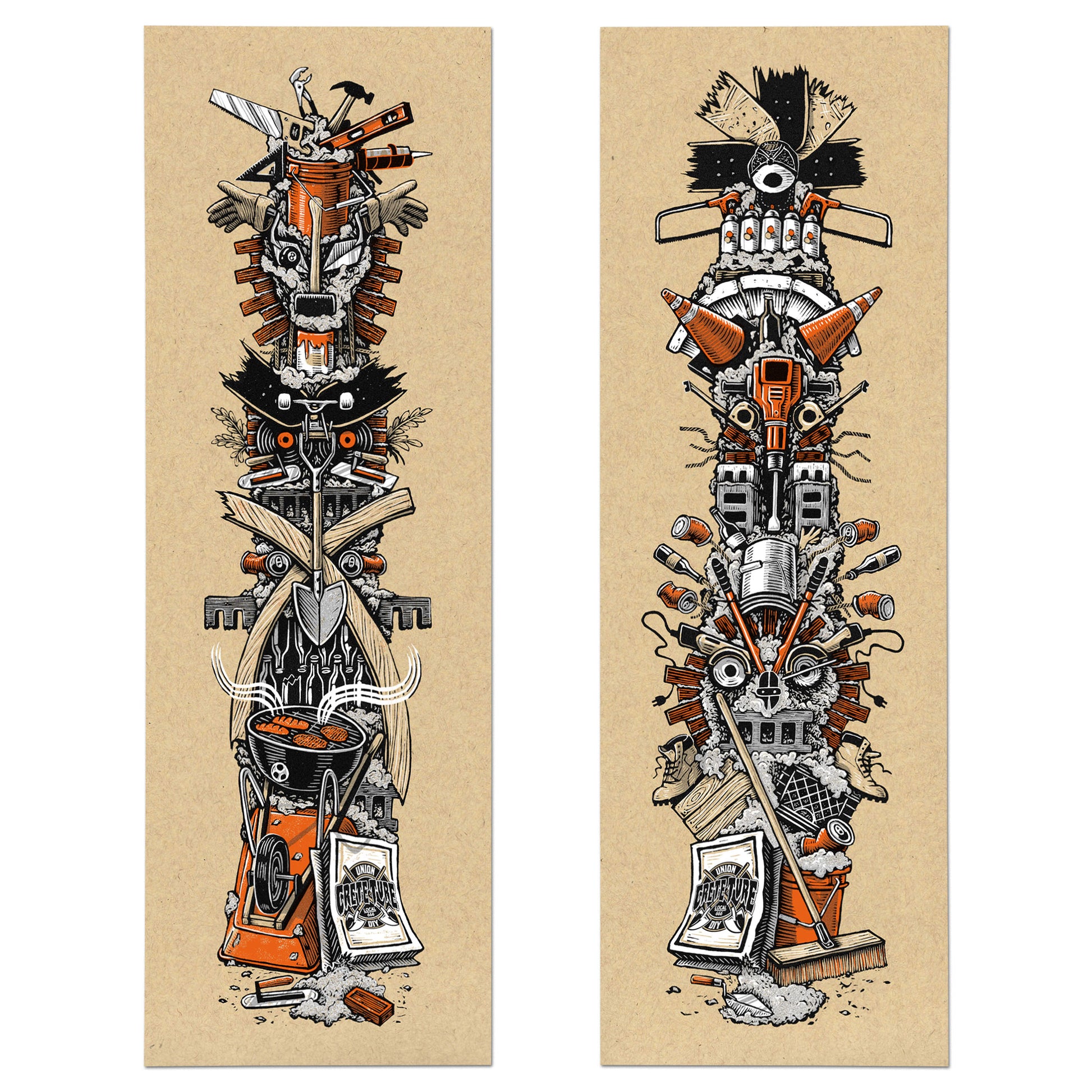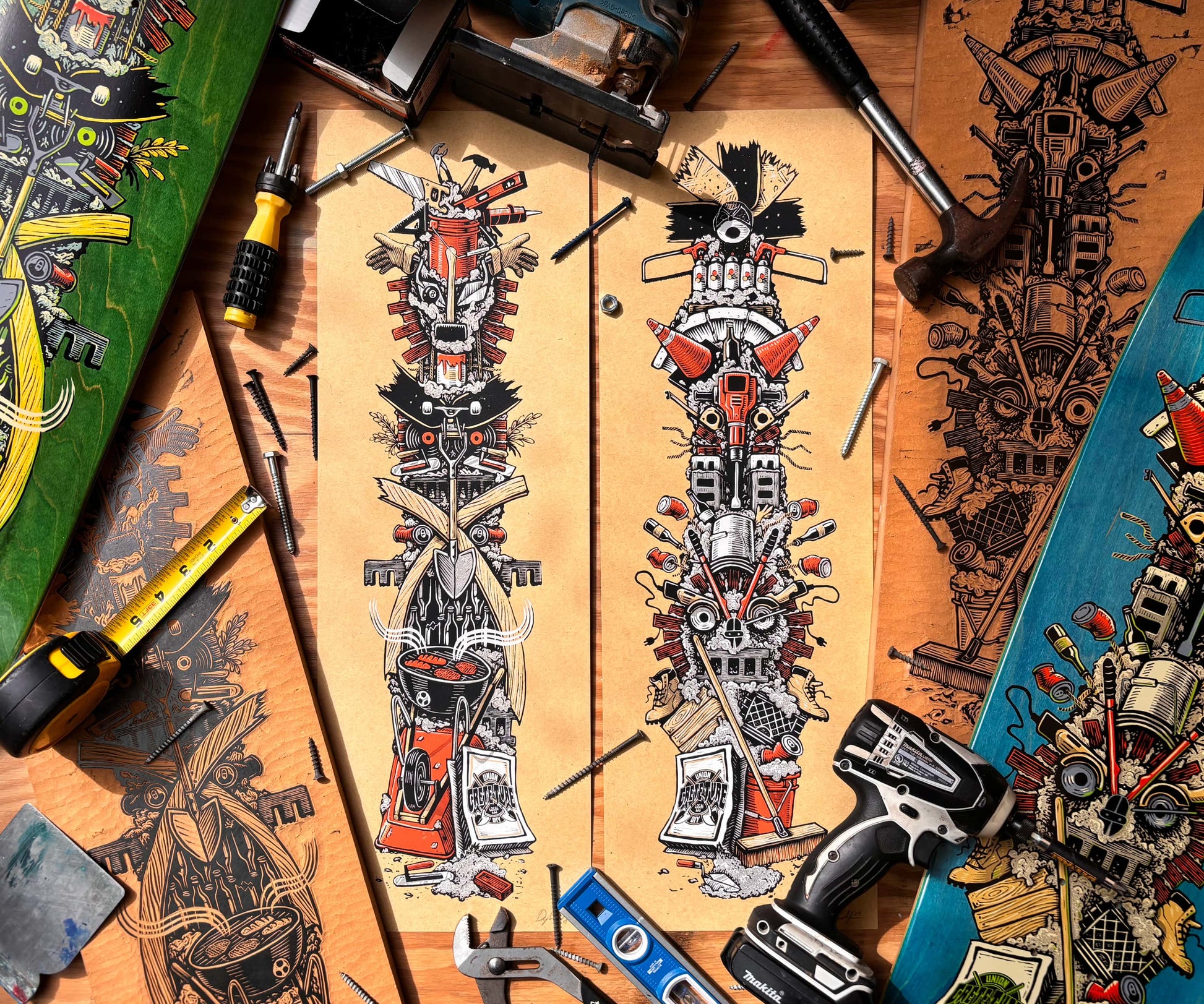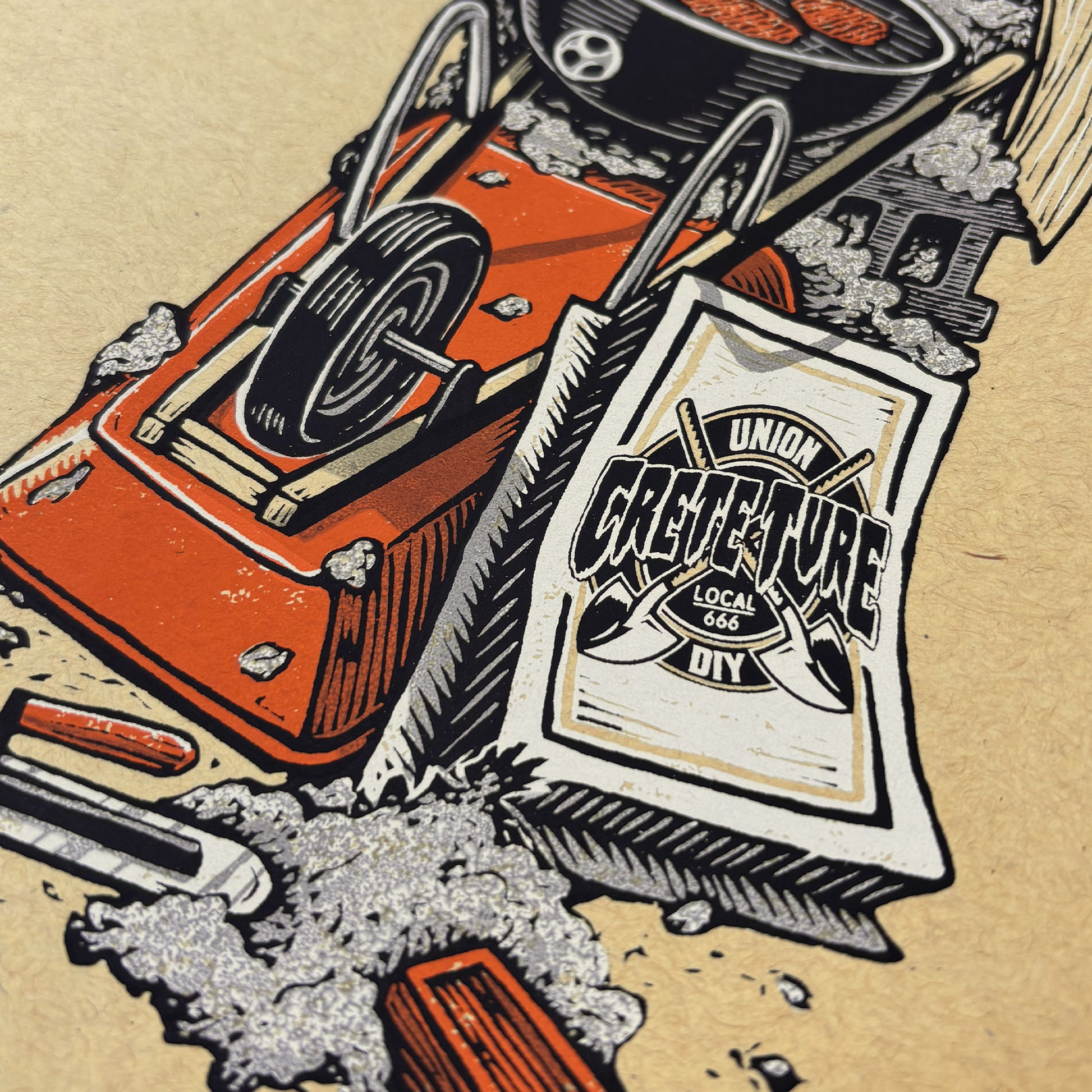 This set of two screen prints capture the organized chaos of DIY skateparks, inspired by the junk craft skaters use as concrete fill. These were originally carved as woodcuts for Creature Skateboard's "Crete-ture Union" series in their Summer 2024 collection, with profits supporting local DIY skateparks across the US.