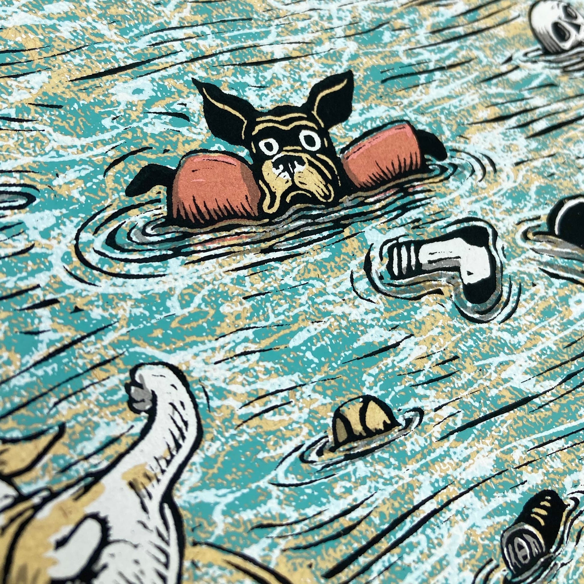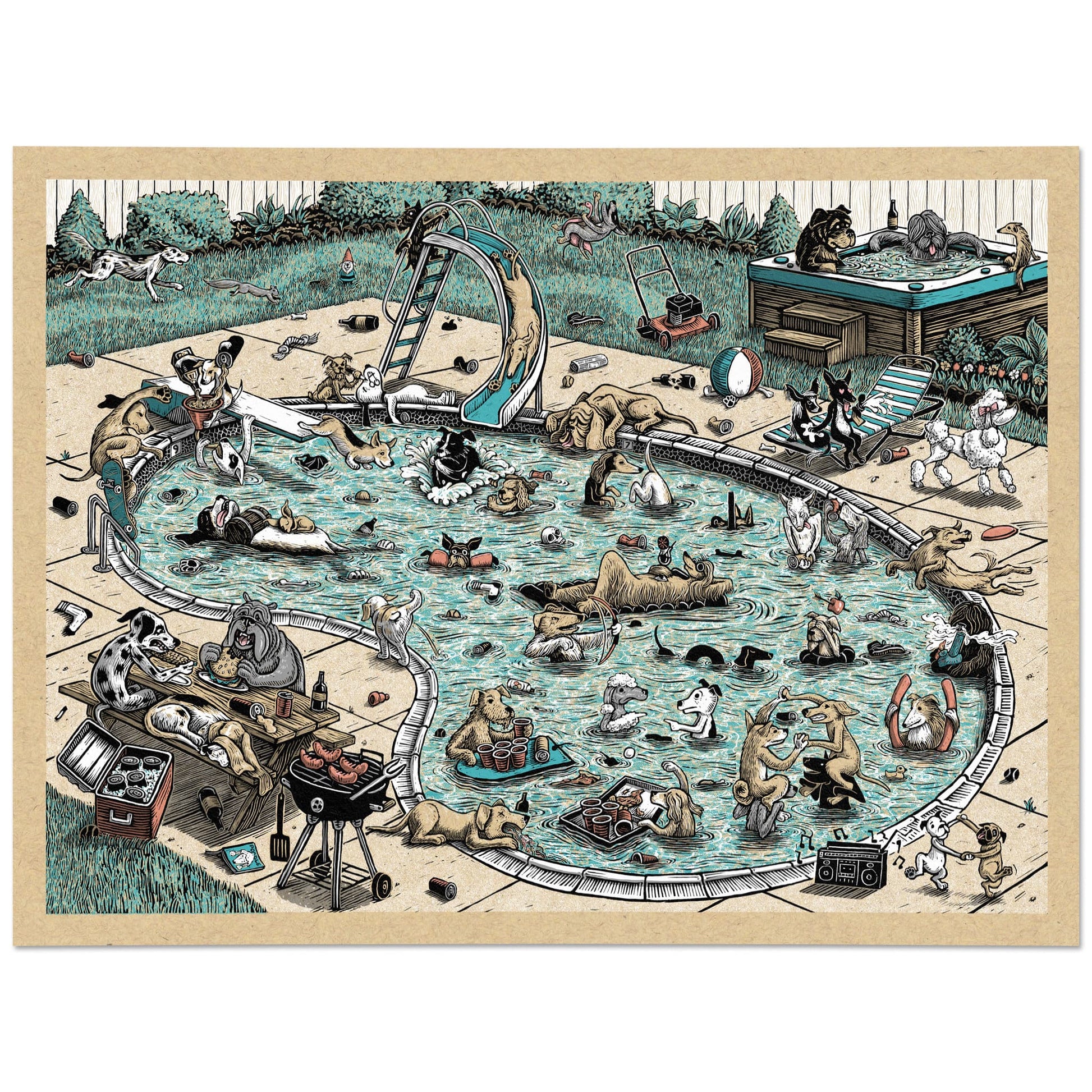 "Drool Party" captures the rowdiness of a backyard pool party with a lively crowd of dogs enjoying every splash, snack, drink, and dunk. Originally illustrated for a Highwater Skateboard deck, this design became one of my all-time favorite graphics I've created.