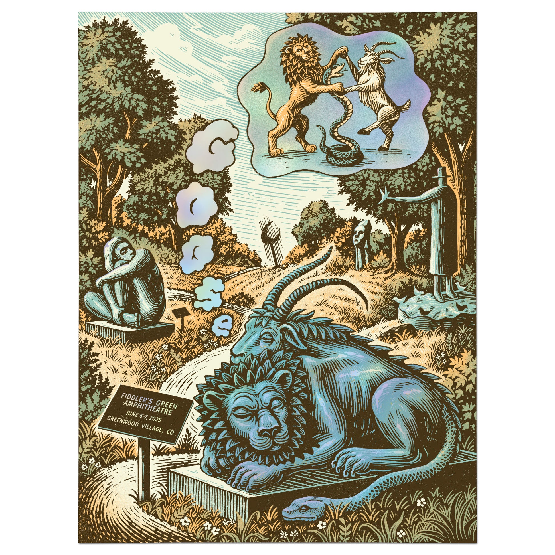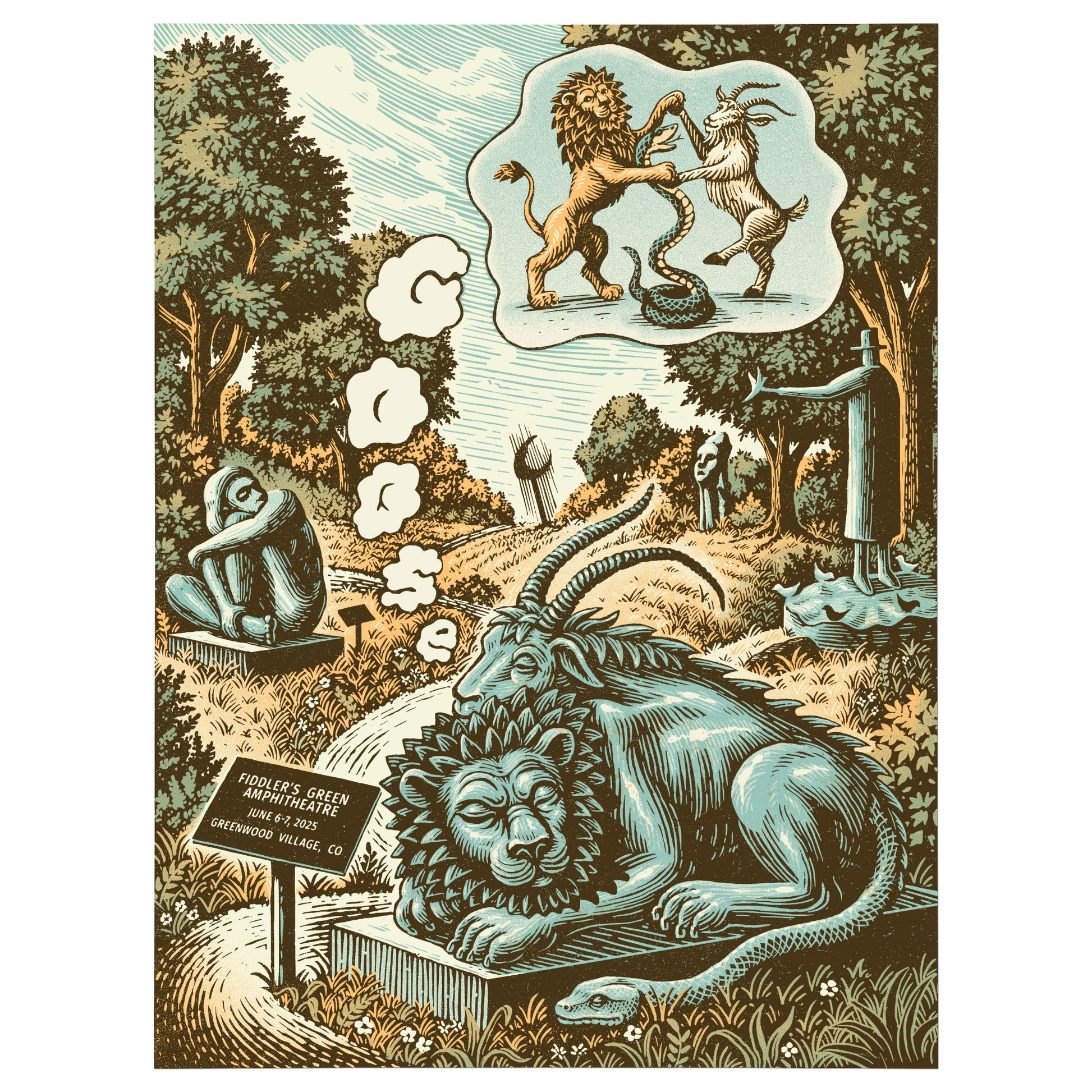 A three color screen print (4 colors on the foil variant) created for Goose's back to back shows at the Fiddlers Green Amphitheater in Greenwood Village, CO on June 6 and 7, 2025.