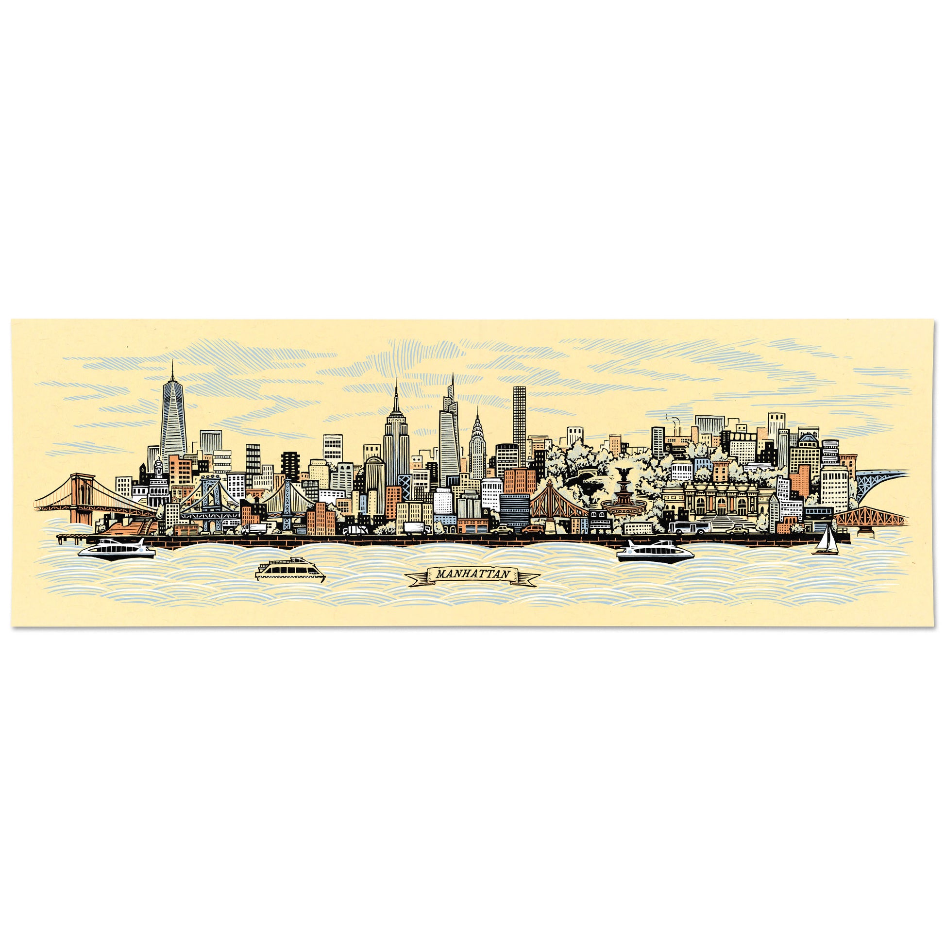Celebrate Manhattan, NY with this screen print featuring the island’s skyline and landmarks, including One World Trade, City Hall, the Brooklyn Bridge, The Empire State Building, Chrysler Building, Central Park, and the MET. And of course, I had to throw in the most iconic NYC skate spot of all NYC the Brooklyn Banks.