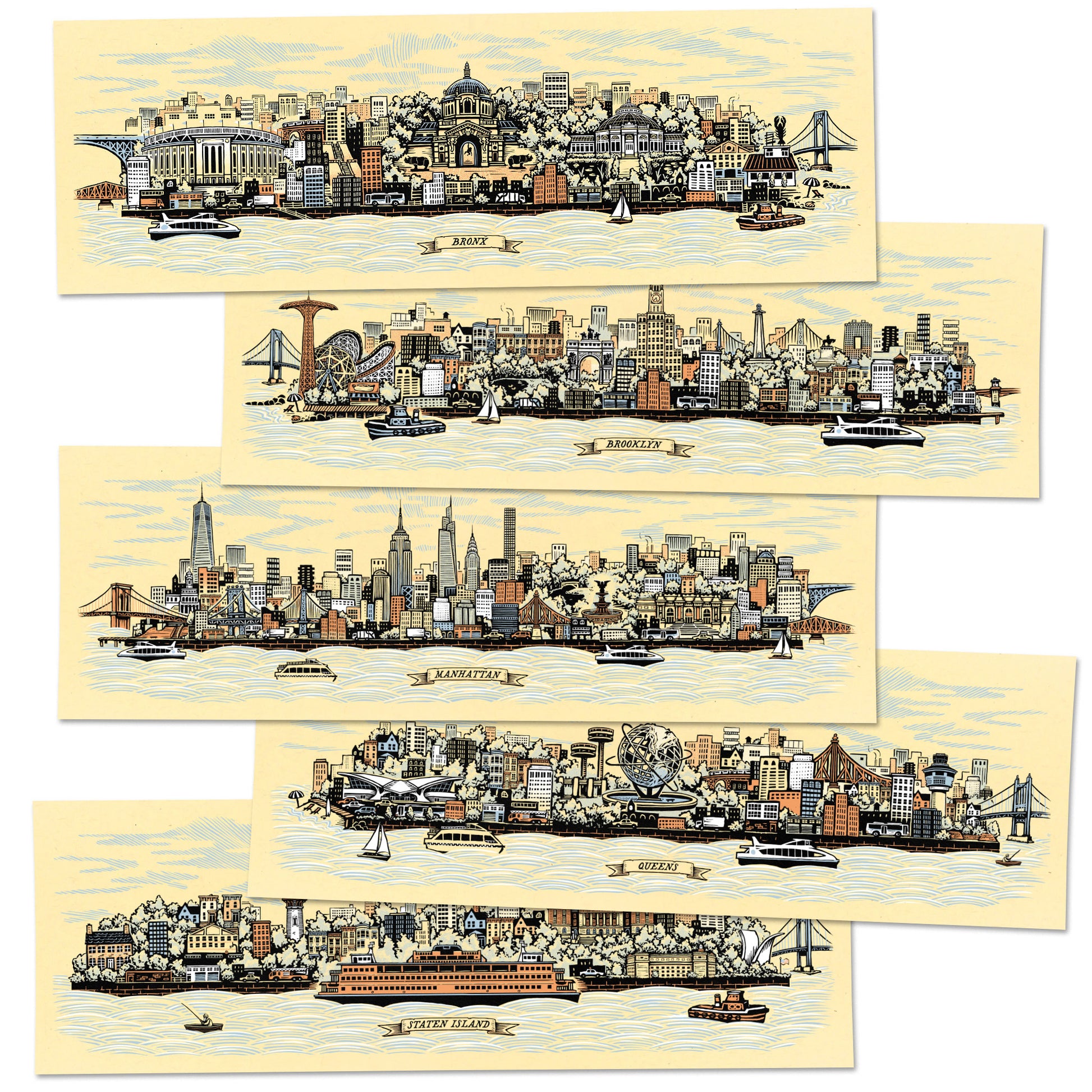 Celebrate NYC with this set of five screen prints featuring skylines and landmarks of all of the 5 boroughs of New York City, including The Empire State Building in Manhattan, Yankee Stadium in the Bronx, Flushing Meadows Unishper in Queens, Coney Island in Brooklyn, and the Statin Island Ferry.