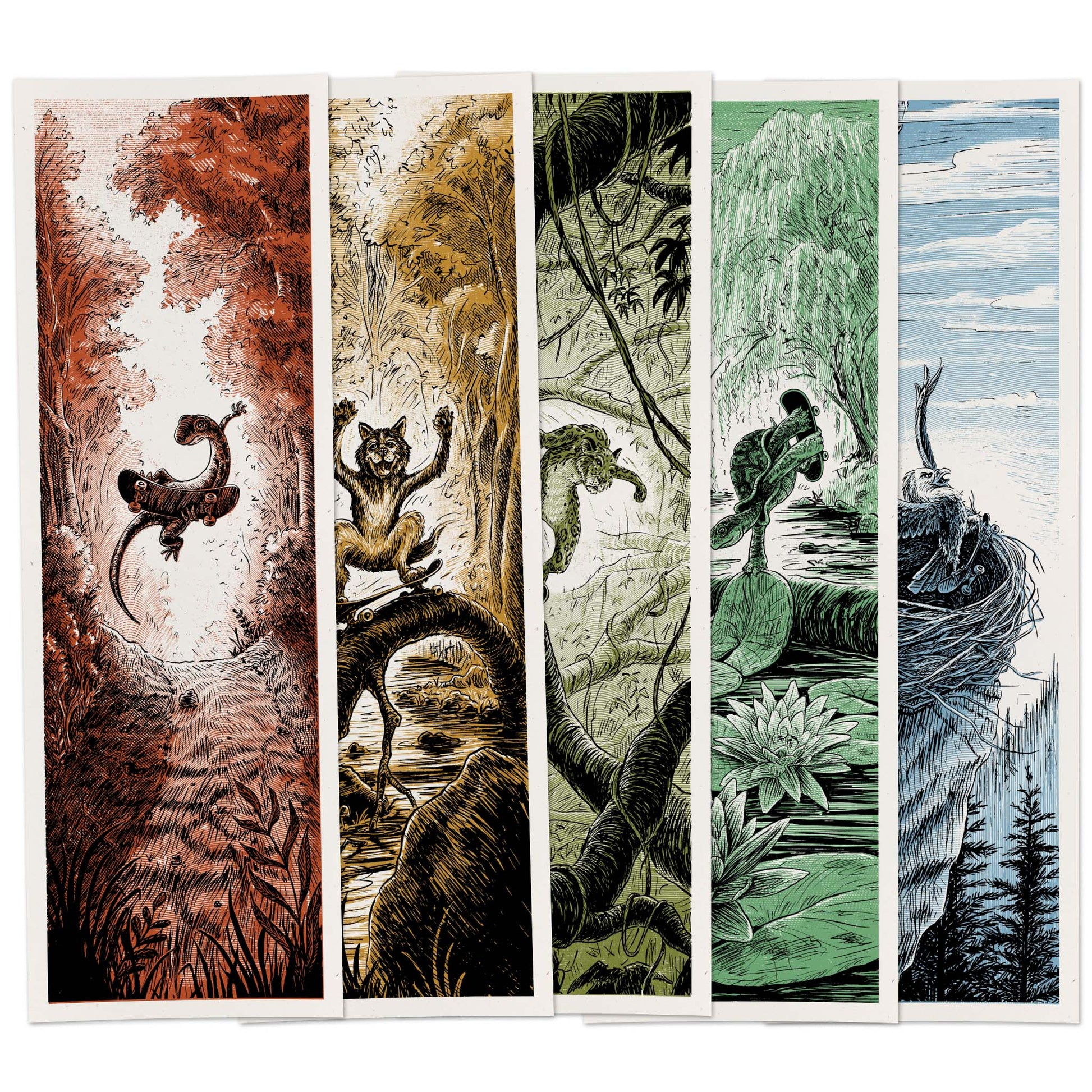 Set of 5 skateboarding animal screen prints, originally illustrated as skateboard graphics for Coda Skateboards, inspired by real skate photos of the Coda Skateboard team.