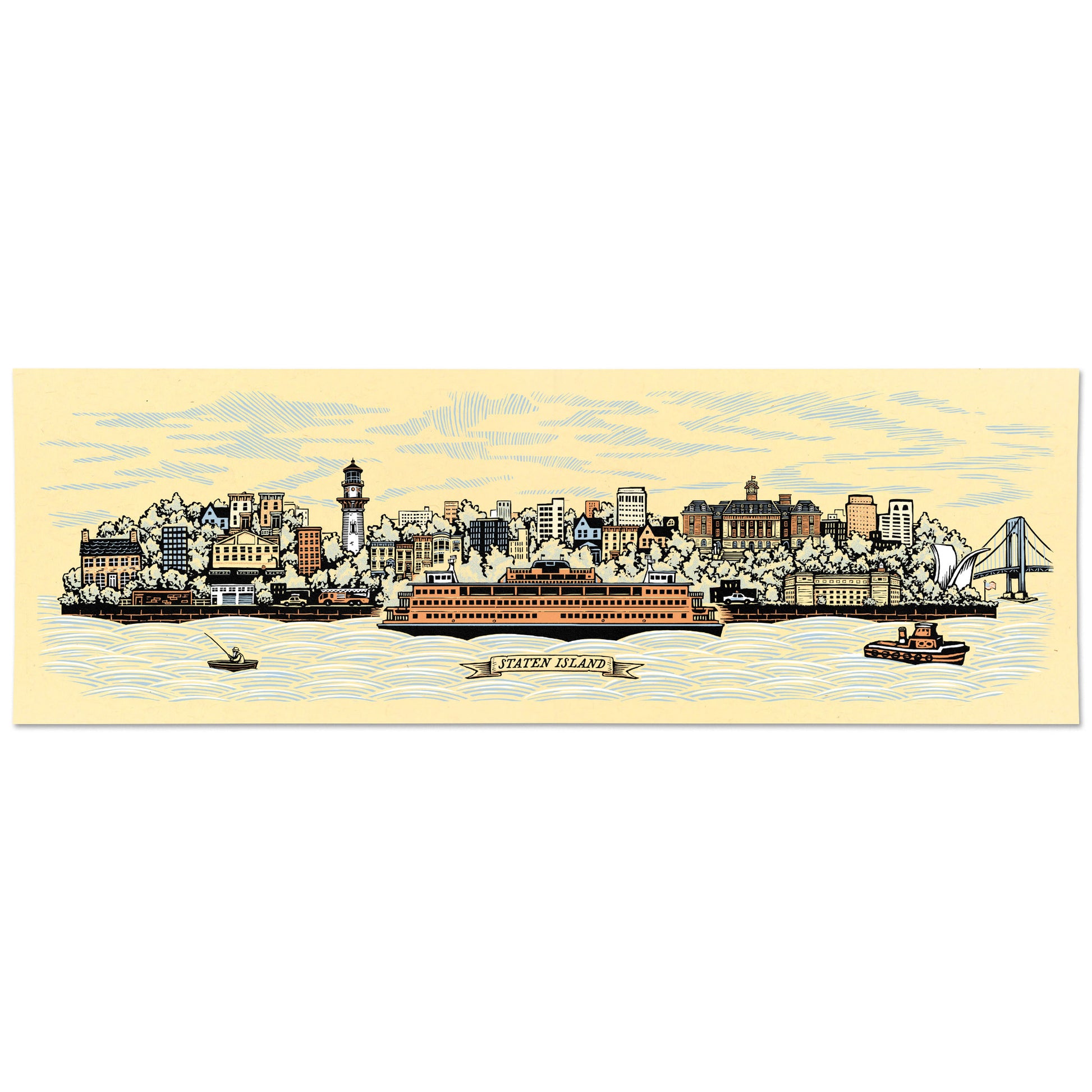 Celebrate Staten Island, NY with this screen print featuring the island’s skyline and landmarks, including Conference House, Range Lighthouse, Borough Hall, Ft Wadsworth, the 9/11 Memorial, and the iconic Verrazano Bridge.