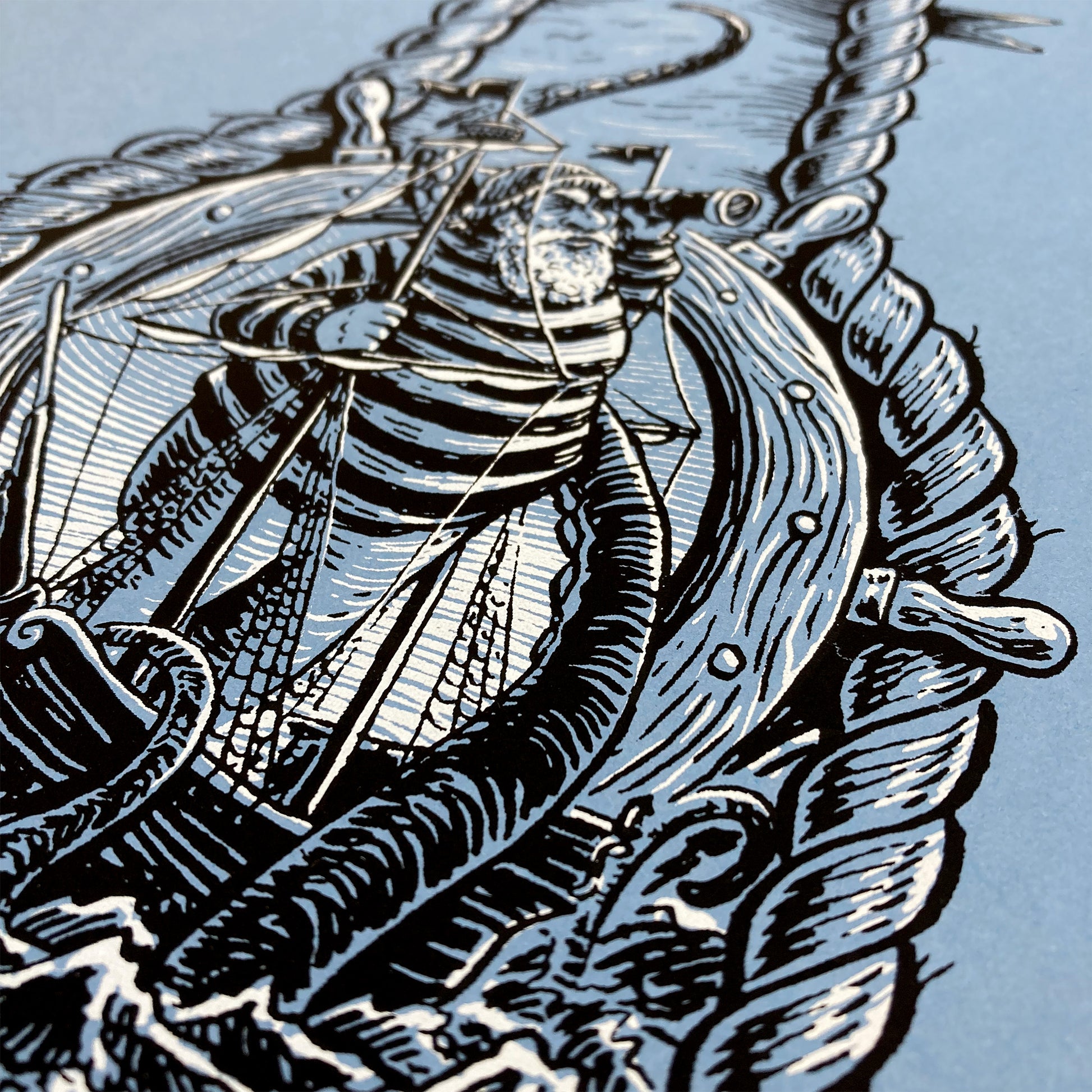 Dive into the nautical legend of Captain Alfred Stormalong with this limited edition screen print, originally illustrated as a skateboard deck graphic for Boston based Highwater Skateboards.